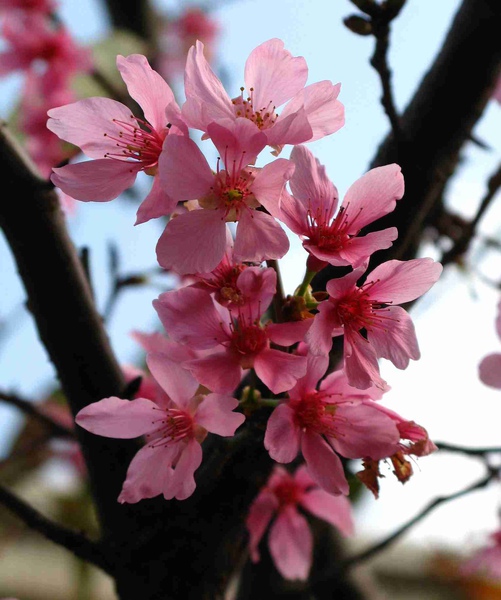 因為樹上仍有葉子,無法以遠拍呈現一片花紅,老師說這種情況適合近拍。於是以近拍模式幫櫻花拍攝特寫。